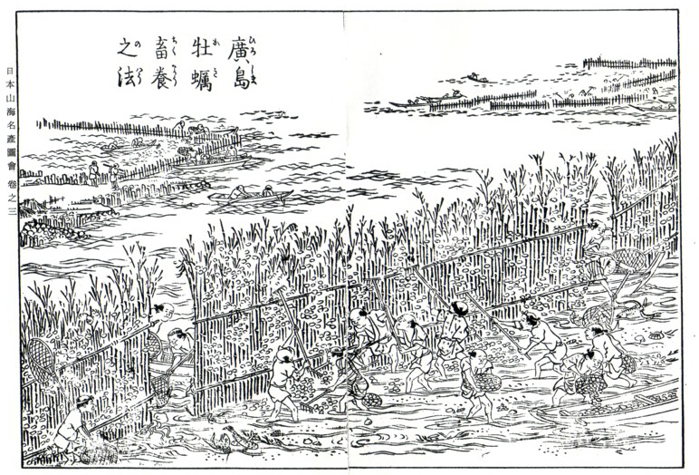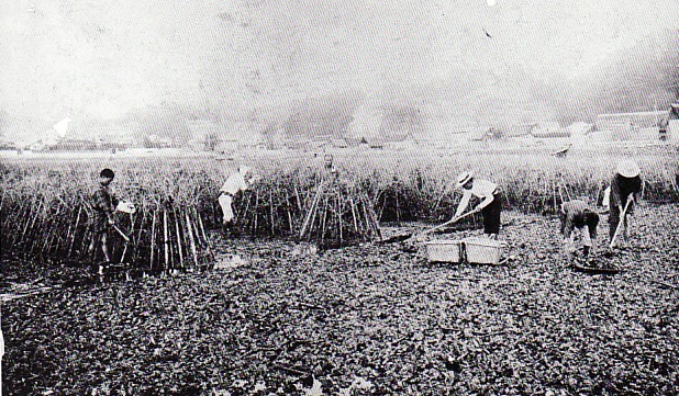 今から300年余り前,延宝元年(1673)草津浦小西屋五郎八が眞竹で,ひび建法で,大量に1年生かき採苗法を考え出した。